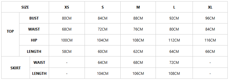 Garment measurements by size (in cm), please allow a measurement tolerance of 1-2 cm.