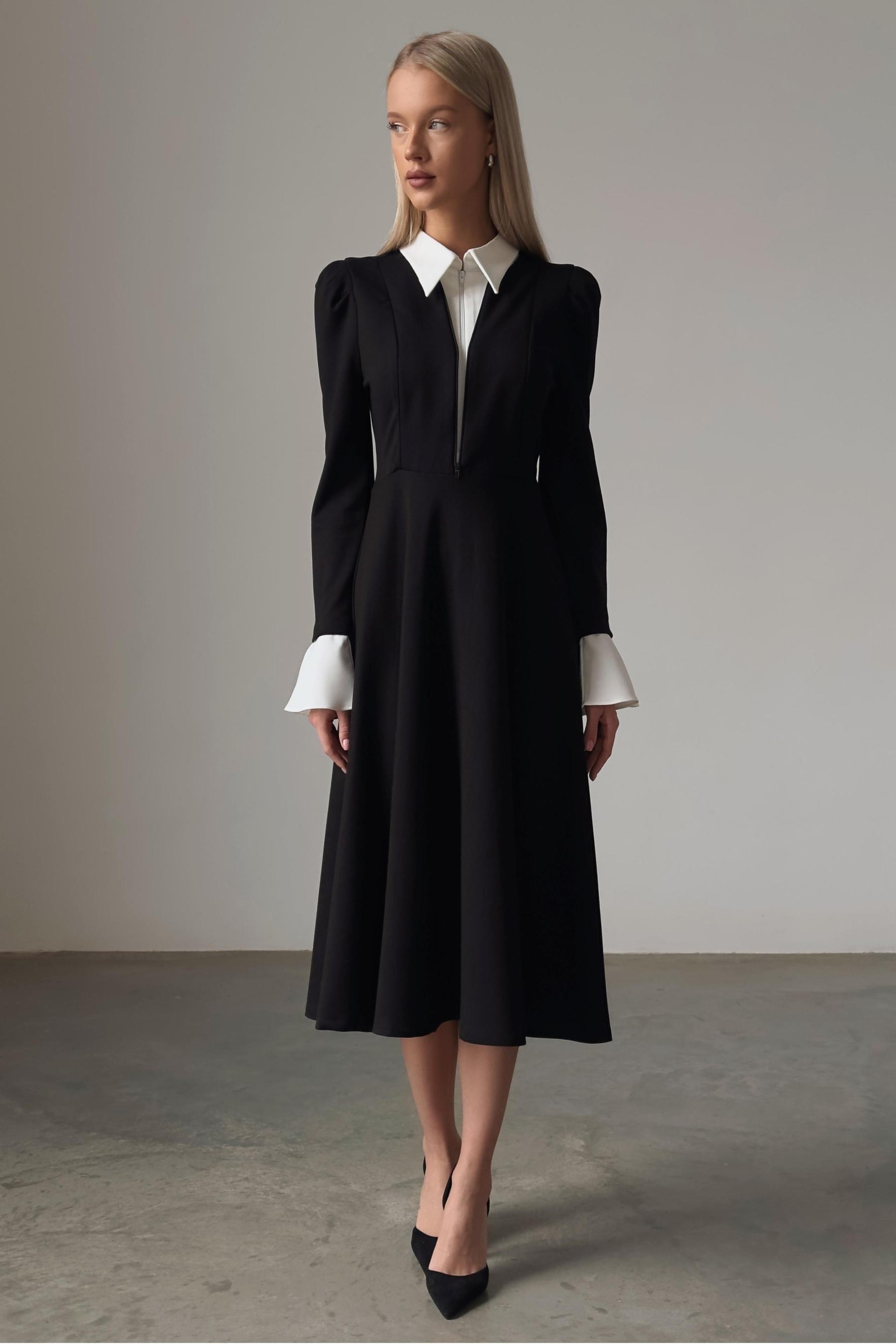 - Long sleeve, black, solid color, midi dress