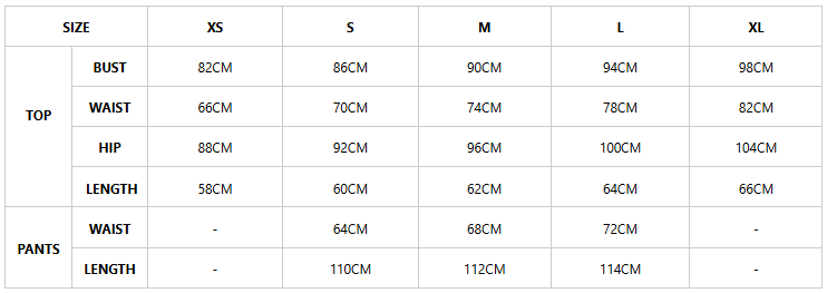 Garment measurements by size (in cm), please allow a measurement tolerance of 1-2 cm.