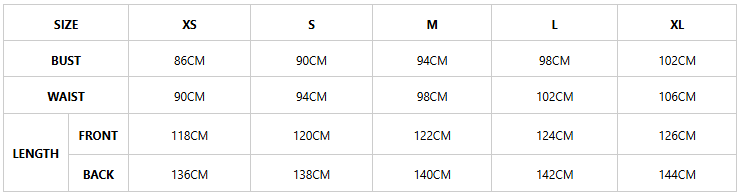 Garment measurements by size (in cm), please allow a measurement tolerance of 1-2 cm.